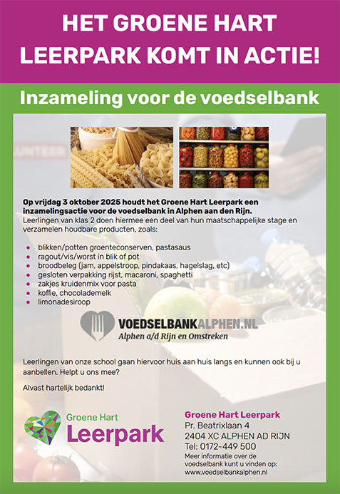 Op vrijdag 3 oktober 2025 houdt het Groene Hart Leerpark een inzamelingsactie voor de voedselbank in Alphen aan den Rijn.